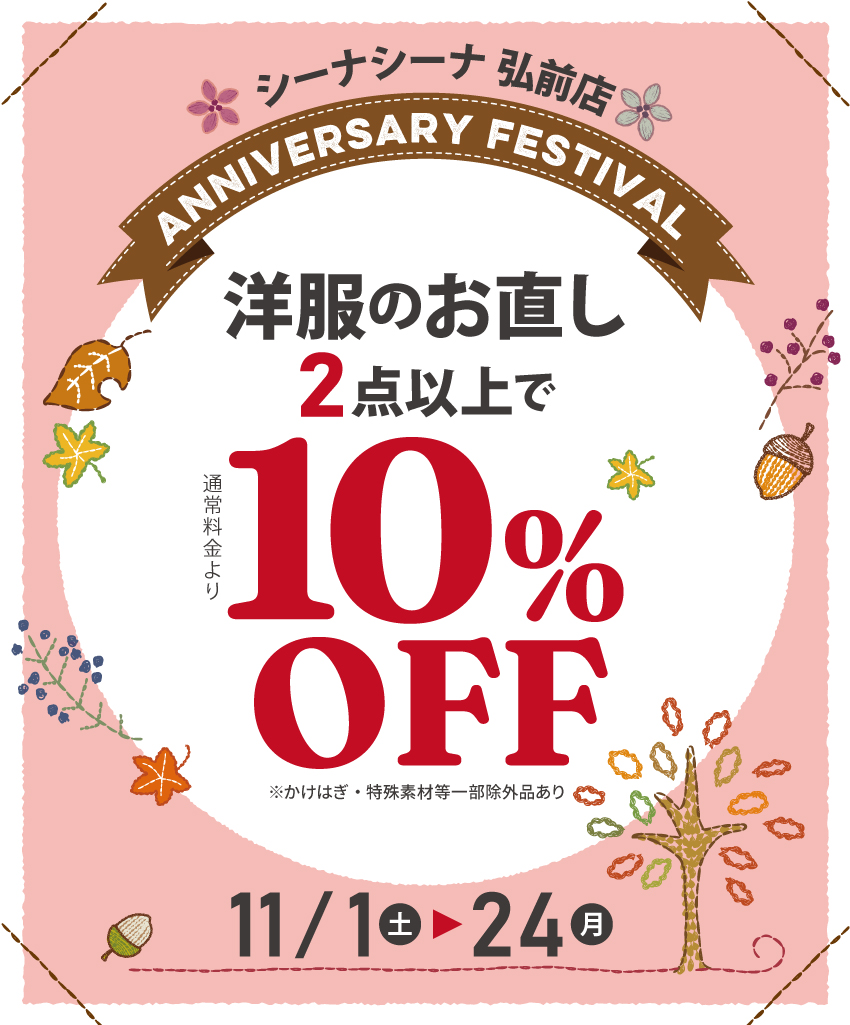 11月1日(土)~11月24日(月)の期間中、洋服のお直し2点以上のお持ち込みで通常料金より10%OFFになるセールを実施いたします。