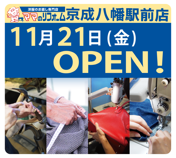 京成八幡駅前店新規オープンを記念して、11/21(金)~12/7(日)の期間中、お洋服のお直し最大20%OFF!のキャンペーンを行います。