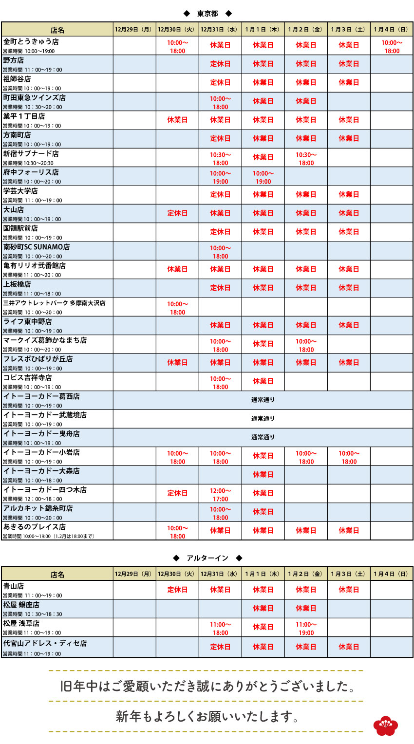 東京都の店舗「年始年始のお知らせ」