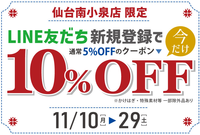 LINE新規友だち登録でもらえる5%OFFクーポンが、11/10(月)~11/29(土)の期間限定でさらにお得な10%OFFになります。