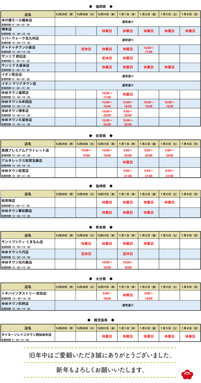 九州エリアの店舗「年始年始のお知らせ」