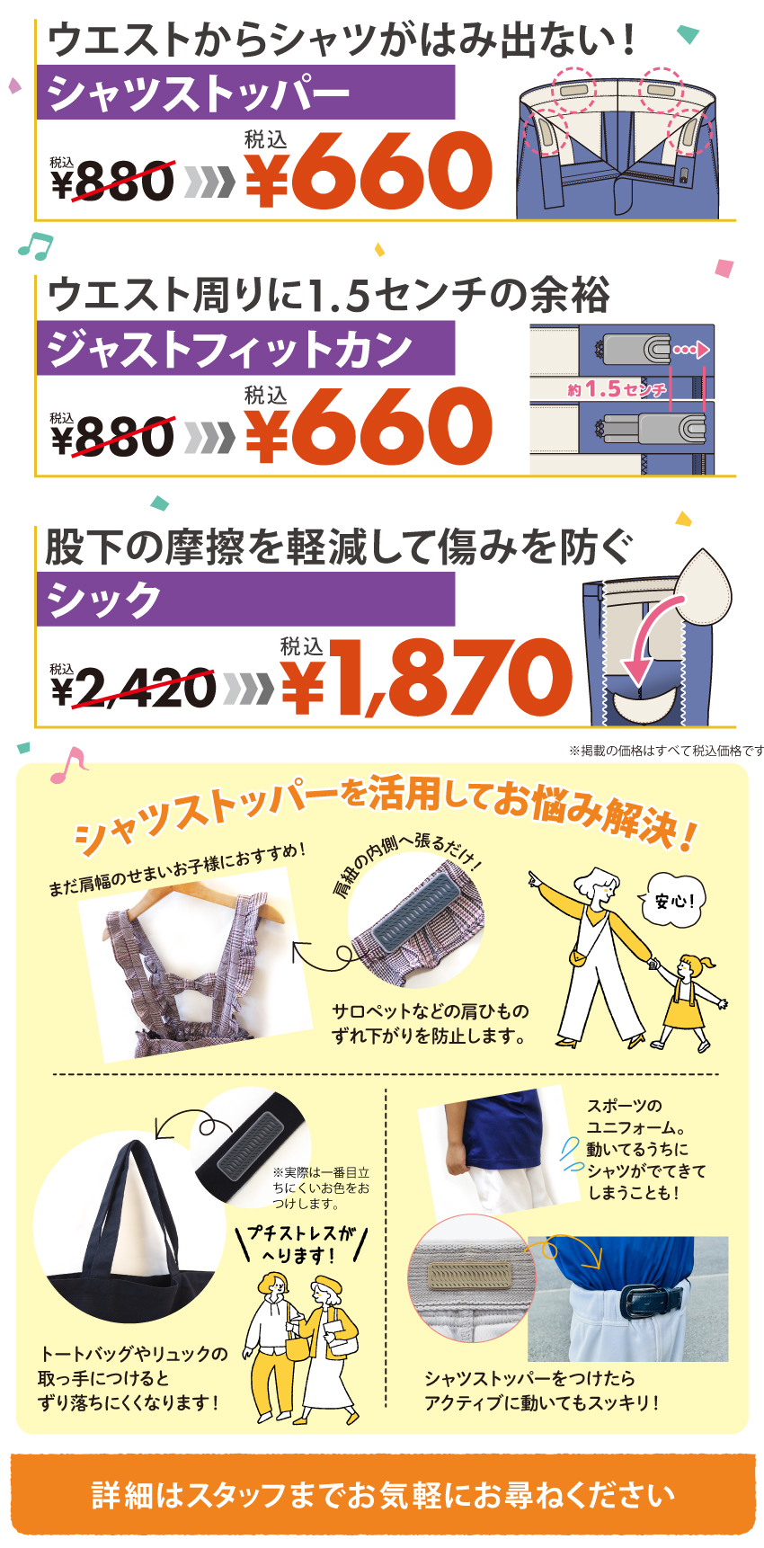 シャツストッパーとジャストフィットカンはパンツだけでなくスカートにも付けられて便利です。