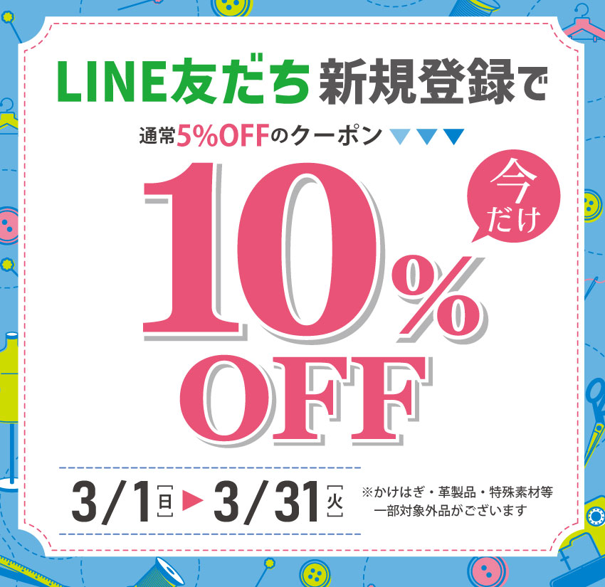 LINE新規友だち登録でもらえる5%OFFクーポンが、3/1(日)~3/31(火)の期間限定でさらにお得な10%OFFになります。