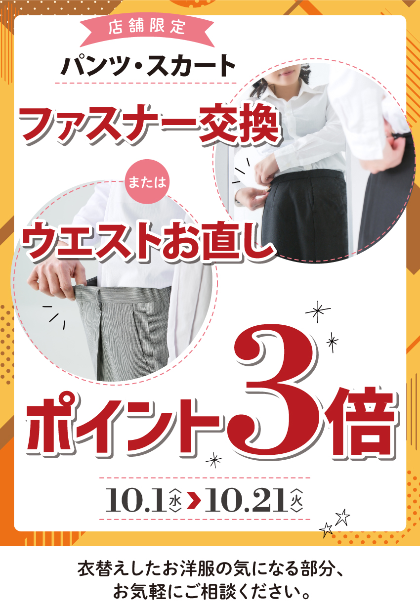 10月1日(水)~10月21日(火)の期間中、パンツ・スカートのファスナー交換またはウエストのお直しで、[ママのリフォーム ポイントカードがポイント3倍!]になるキャンペーンを実施いたします。